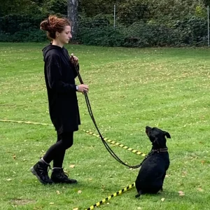 Der Hund wird dazu gebracht, den Menschen im besten Fall von oben nach unten zu beobachten. Denn jede Bewegung von uns Menschen beginnt im Kopf, „geht dann über den Blick, in die Schultern, in den Bauch, in die Hüften, in die Beine und dann in die Füße“.